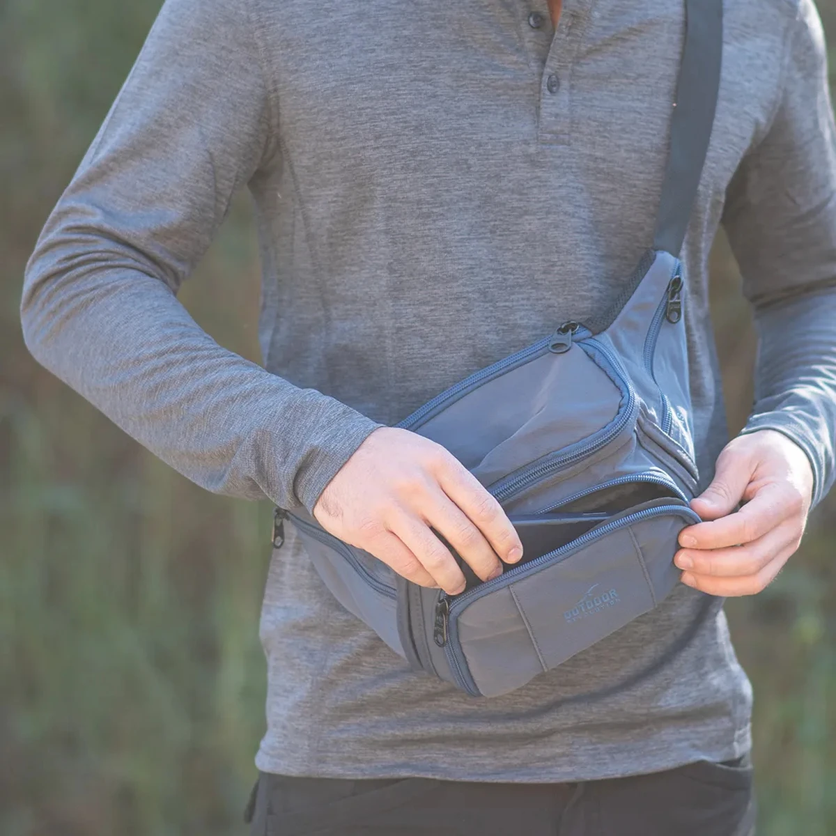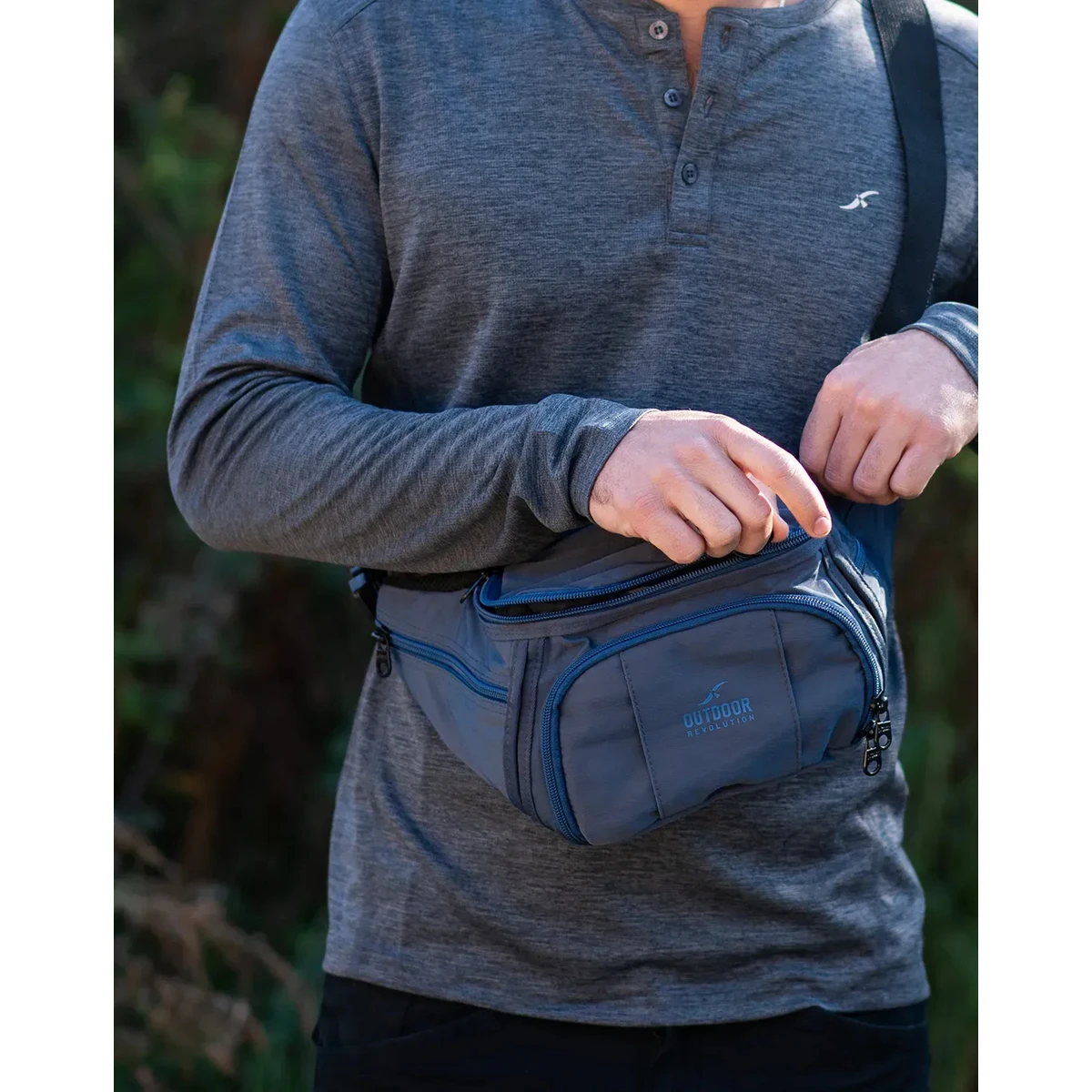 תיק מותן בנפח 3 ליטר מבית OUTDOOR REVOLUTION לנשיאת ארנק, טלפון נייד וציוד קטן נוסף בקלות ובנוחות עשוי מבד דוחה מים ומצוייד בתא מרכזי, כיס קדמי עם חלוקה, שני כיסי צד שבאחד מהם יש תא לטלפון נייד וכיס אחורי נסתר