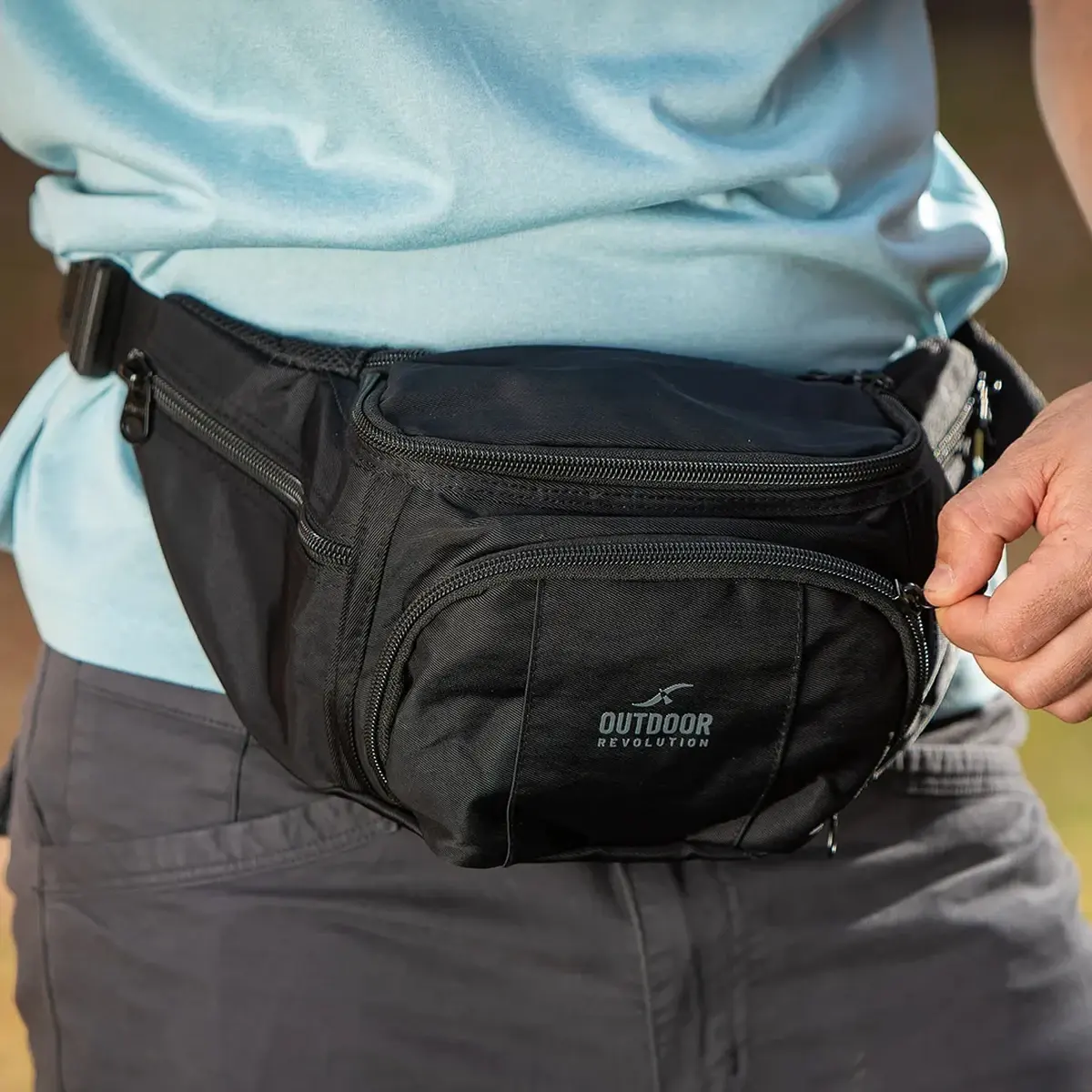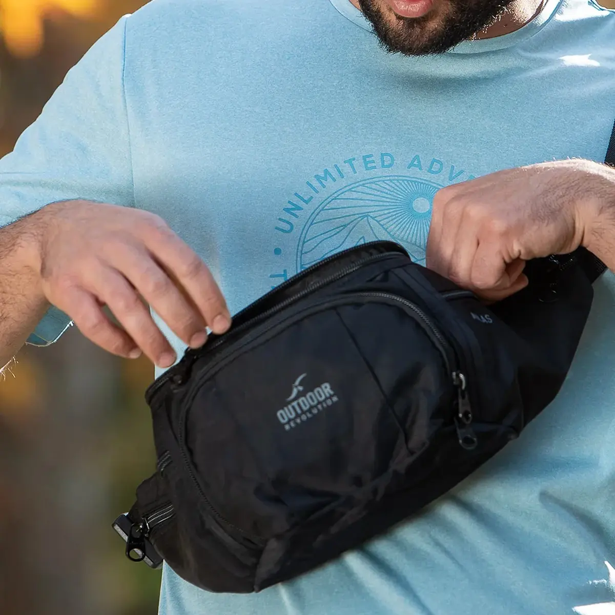תיק מותן בנפח 3 ליטר מבית OUTDOOR REVOLUTION לנשיאת ארנק, טלפון נייד וציוד קטן נוסף בקלות ובנוחות עשוי מבד דוחה מים ומצוייד בתא מרכזי, כיס קדמי עם חלוקה, שני כיסי צד שבאחד מהם יש תא לטלפון נייד וכיס אחורי נסתר
