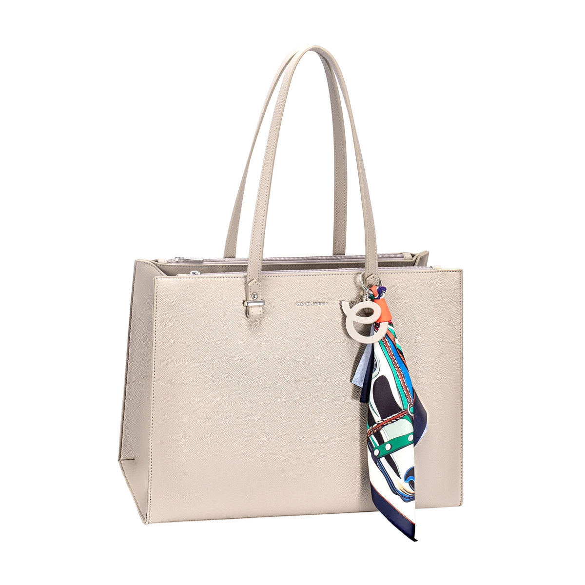 תיק צד גדול מרובע בעיצוב נקי עם בנדנה צבעונית תלויה על הידית ותליון לעיטור