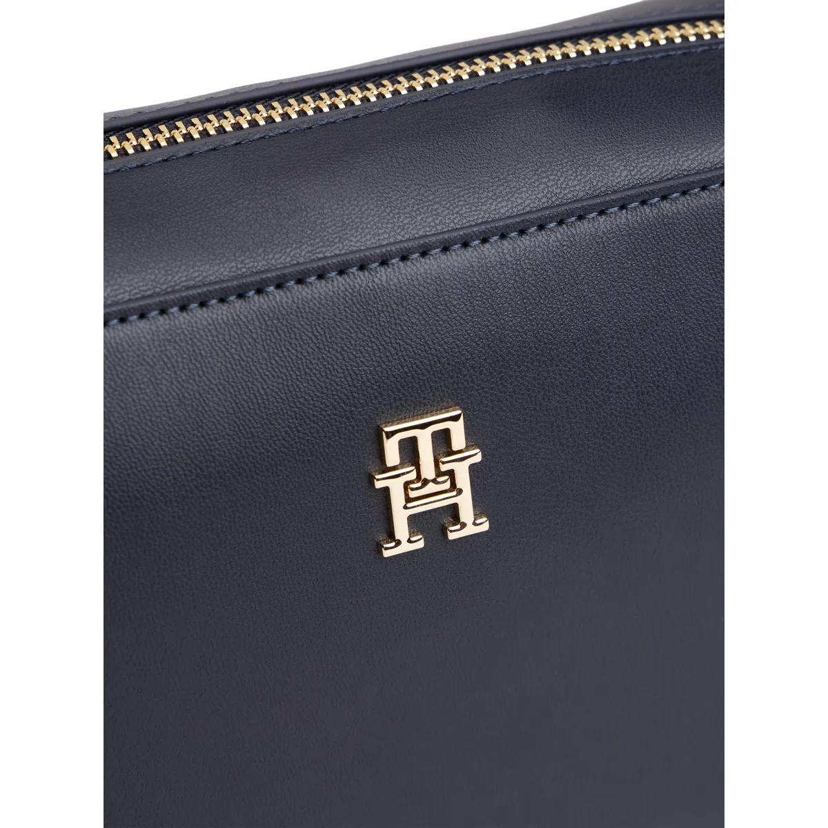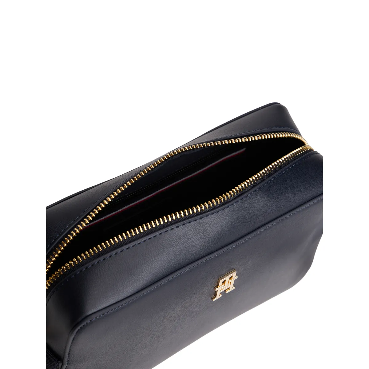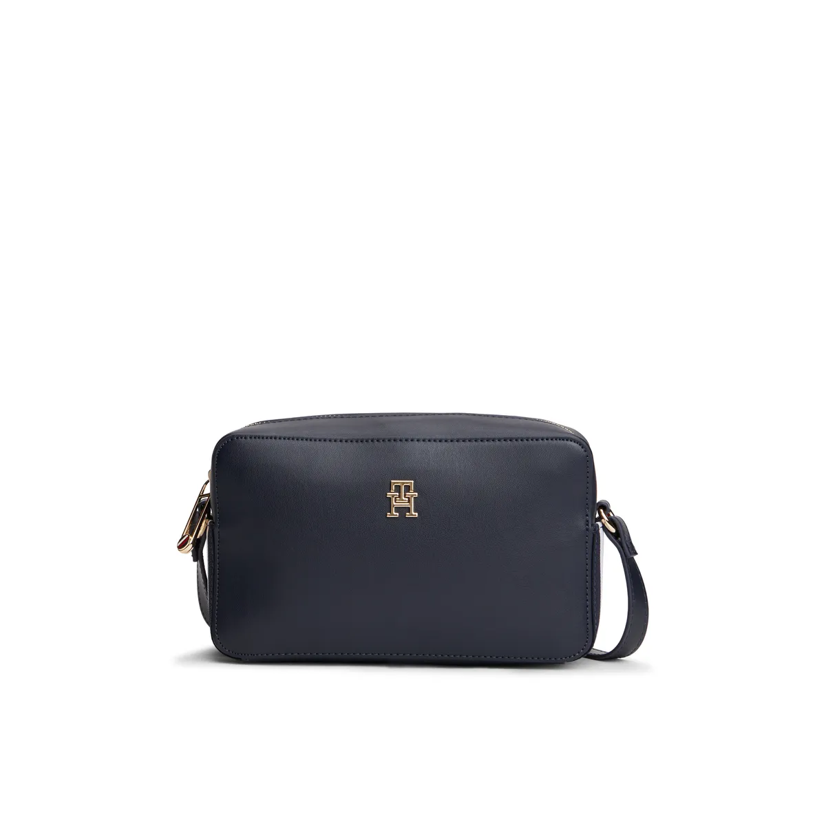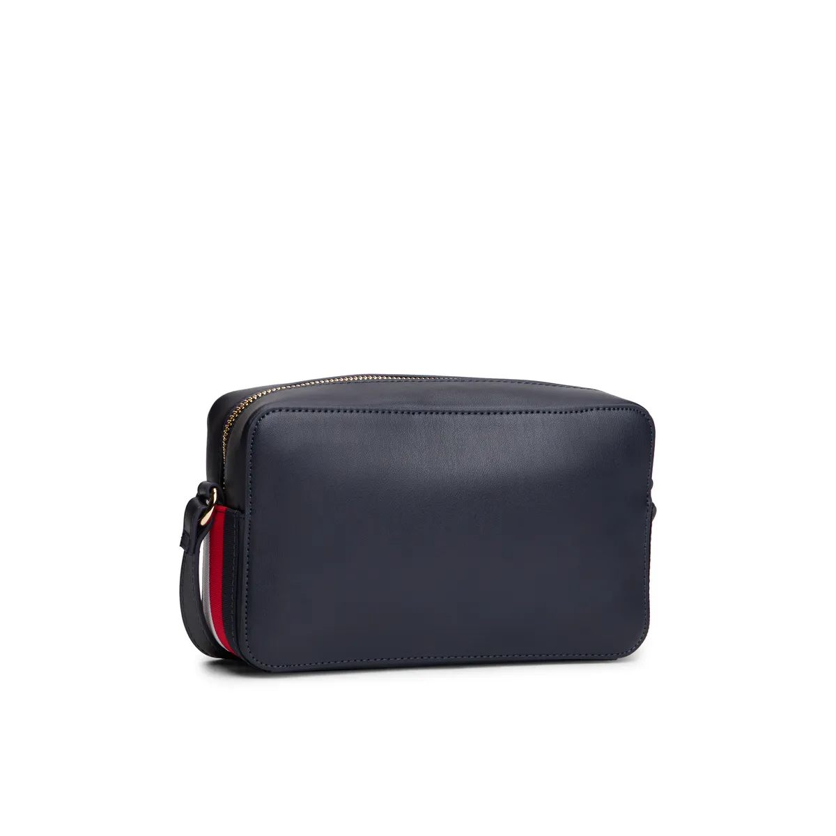 תיק צד קטן בעיצוב נקי עם לוגו בצבע זהב ובתחתית תיפורי פסים בצבעי המותג אדום ולבן